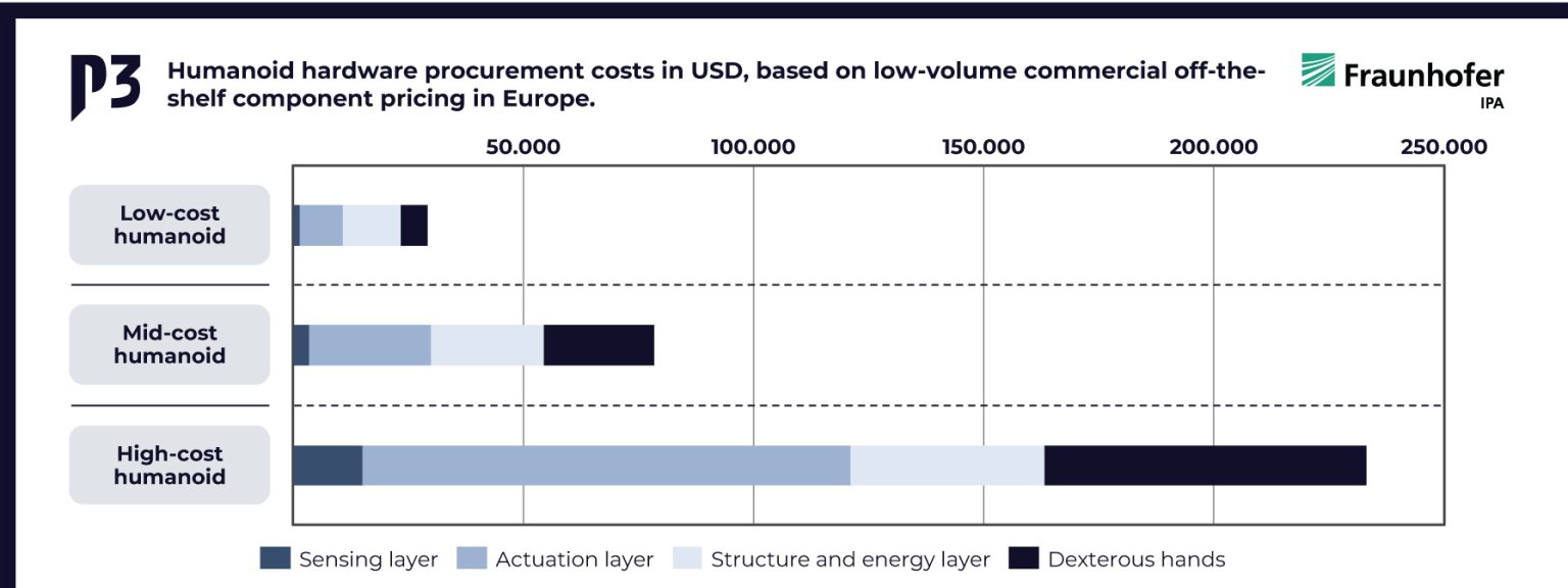 Um diese Herausforderungen zu quantifizieren, kombiniert die Studie eine mehrschichtige Analyse humanoider Hardwarearchitekturen mit einem Bottom-up-Kostenmodell. Die daraus resultierenden Kostenszenarien, zusammengefasst in Abbildung 1, ermöglichen einen strukturierten Vergleich von Niedrig-, Mittel- und Hochkosten-Konfigurationen humanoider Systeme und veranschaulichen, wie unterschiedliche Hardwareentscheidungen die Gesamtsystemkosten beeinflussen. Die Analyse hebt jene Hardwarekomponenten hervor, die den Gesamtaufwand dominieren und zentrale Herausforderungen für eine kosteneffiziente Skalierung darstellen – insbesondere bei humanoiden Systemen für den kontinuierlichen Industriebetrieb.